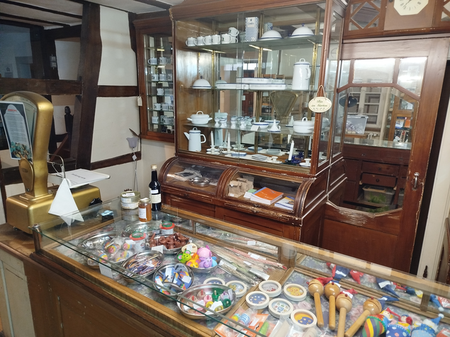 Allein die Ausstattung unseres Museumsladens lohnt einen Abstecher in das Eingangsgebäude Haus Wolfersweiler. In den Schränken und Vitrinen des ehemaligen Schokoladenhauses Mathias aus Bad Kreuznach finden sich hier die guten alten Dinge, die es woanders nicht mehr gibt: Nach historischen Vorbildern gefertigtes Blechspielzeug, Emaillegeschirr oder Textilien.